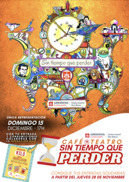 ¡Nos vemos en un espectáculo único el domingo 15 de diciembre! Entrada a las 17h de la tarde. Sin tiempo que perder, café-teatro en el que podrás disfrutar de un evento único creado por los adolescentes y jóvenes del Centro Juvenil Don Bosco. Además, podrás compartir tiempo con los tuyos tomándooslo algo y/o cenando. Todos los beneficios irán destinados a nuestra Campaña de Navidad Solidaria de la Operación Kilo, para Cáritas Parroquial y aquellos que más lo necesitan en nuestro barrio.